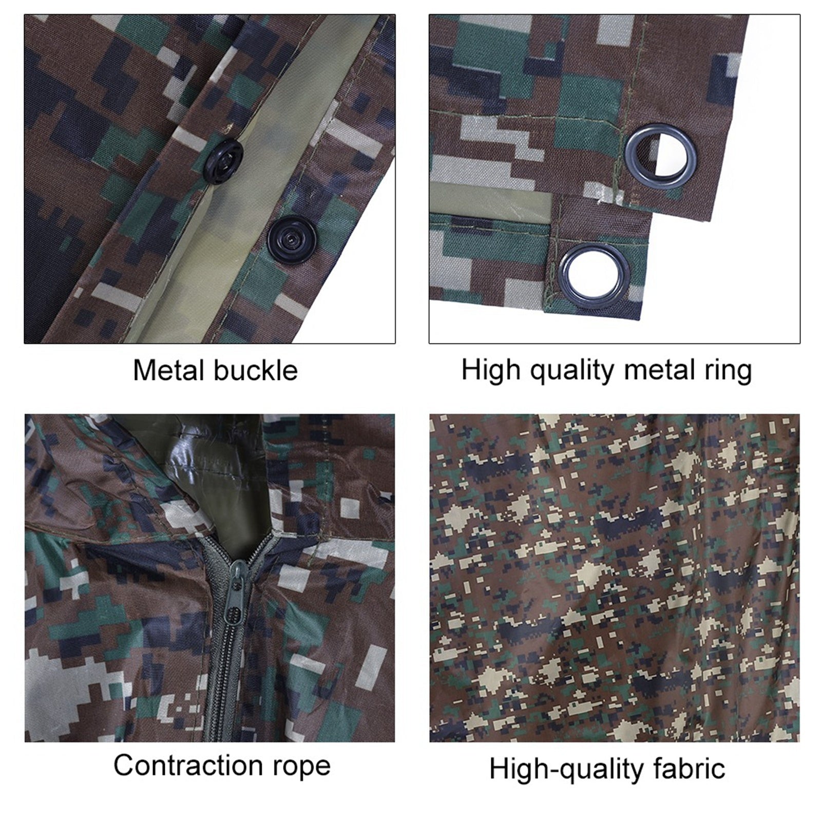 1、Suitable for outdoor activities, like camping, hiking and fishing and other things you need to keep dry. 2、Ideal for rainy day, can be used as a makeshift backpack cover, aslo a disguise in military game. 3、Easy to carry, foldable, just keeping in the car as an emergency raincoat. 4、Material made by PVC, tear resistant and durable to use. 5、There are brass eyelets and press studs on each side.